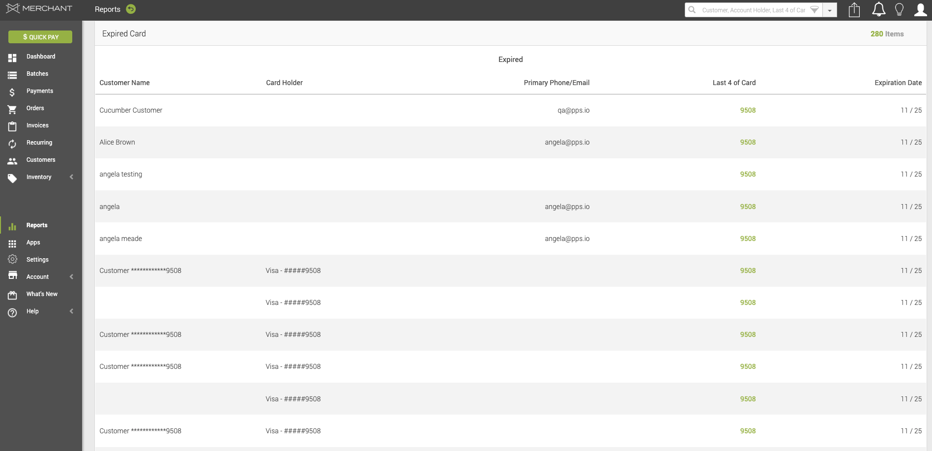 Use Activity reports to identify expired cards and review user-initiated transactions with clear visibility into customer details, payment methods, and processing status.