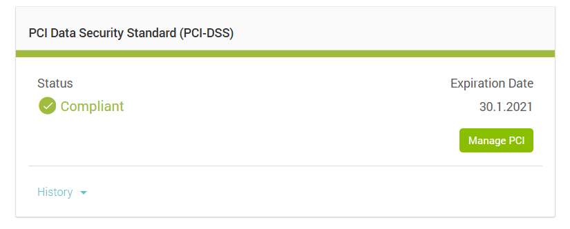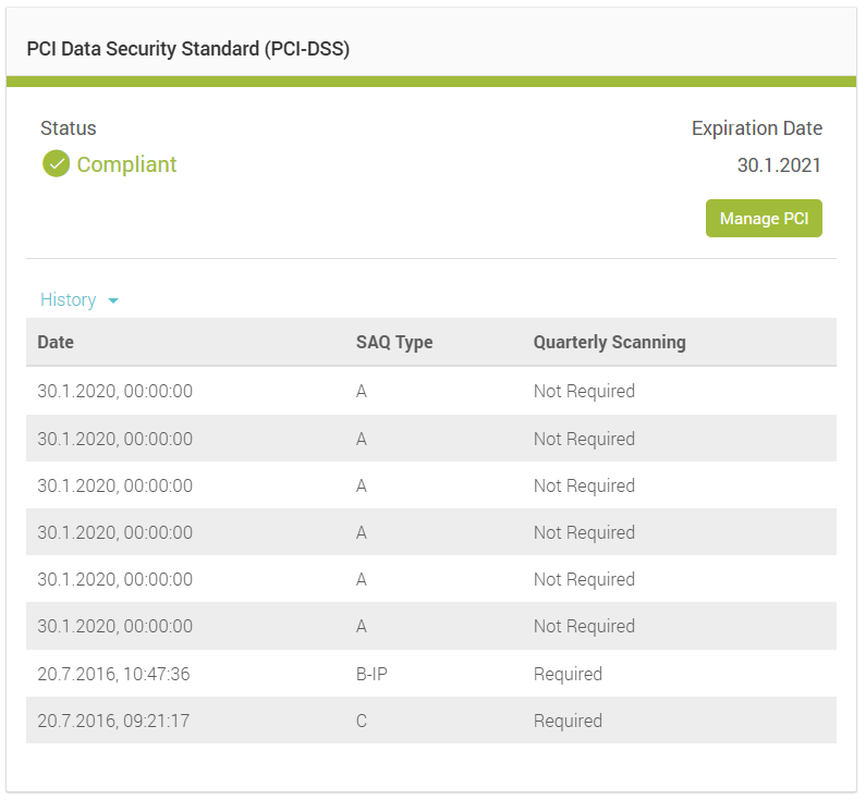 By clicking on the blue History button, you'll see the following information about previous SAQ (Self-Assessment Questionnaire) completions: