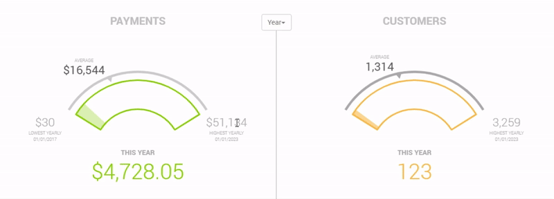 - Year - displays the lowest yearly unique customer count registered (since starting processing with MX™ Merchant) and the average yearly, unique customer count registered on the meter. Below the meter is the unique customer count for the current year.