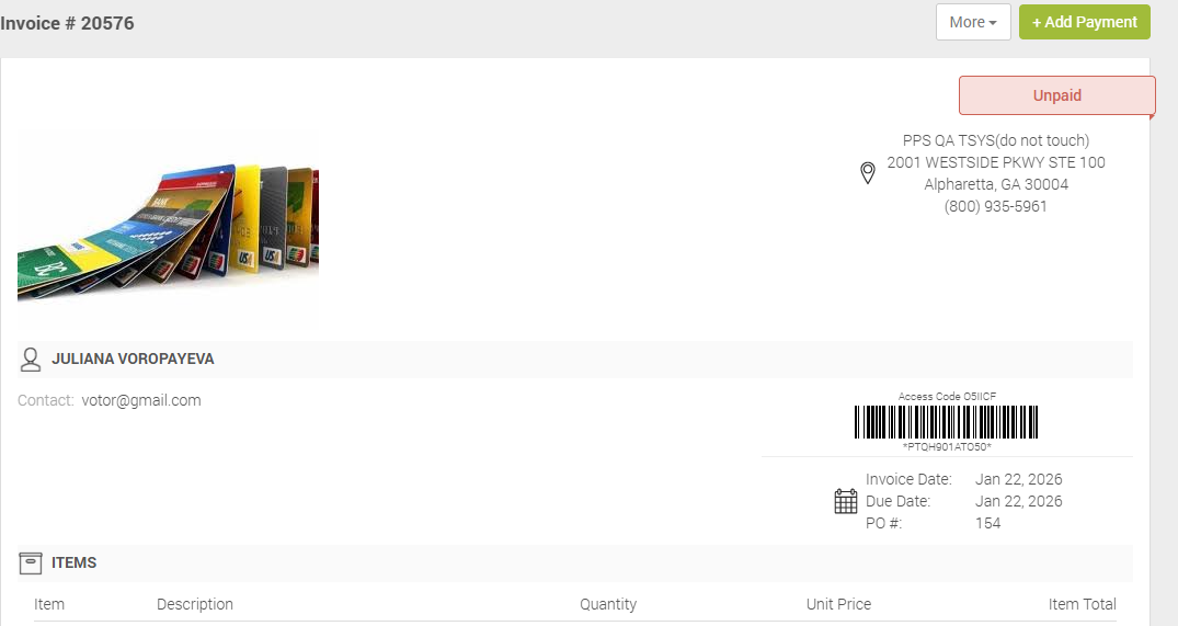 If the invoice is unpaid, an Unpaid tag will show up in the top-right corner.