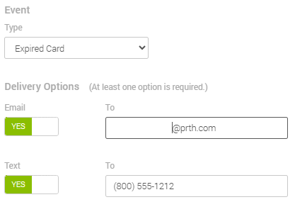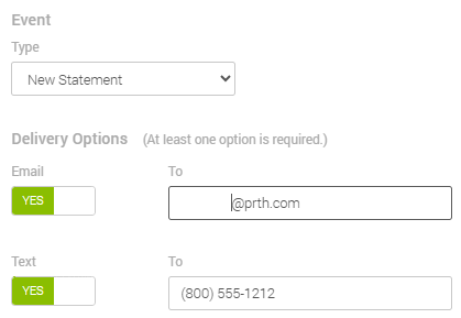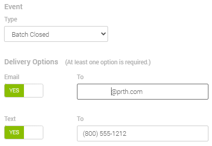 - Choose at least one of the Delivery Options, and enter the desired contact information.