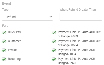 - In When: Payment Greater Than, enter the minimum refunded amount at which you would like to be notified. MX™ Merchant will put in 0 by default, meaning that any refund amount will be reported.