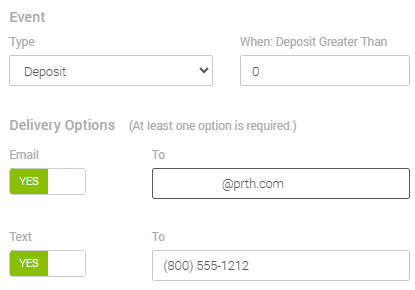 - In When: Deposit Greater Than, enter the minimum deposit amount at which you would like to be notified. MX™ Merchant will put in 0 by default, meaning that any deposit will be immediately reported.