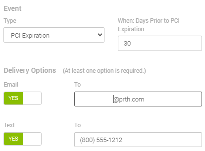 - In When: Days Prior to PCI Expiration, enter the number of days in in advance of the expiration of your SAQ you would like to be notified. MX™ Merchant will put in 30 by default.