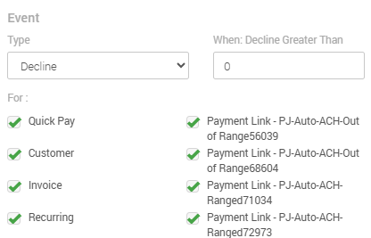 - In the For section, you will find several sources in which a decline could generate, including Quick Pay, Invoice, MX Express, MX Retail, payment links, among others. Choose at least one of them.