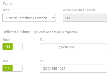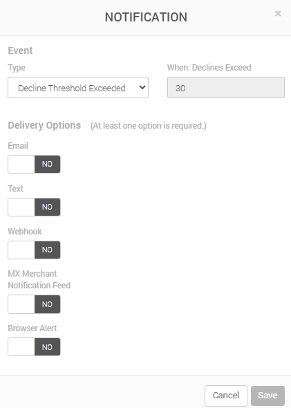 - In When: Declines Reach, you will see the number the number of declines that need to occur in a single day for you to be notified. Because of a setting done on MX™ Connect, MX™ Merchant will put in 30 by default, and it can't be modified in this section.