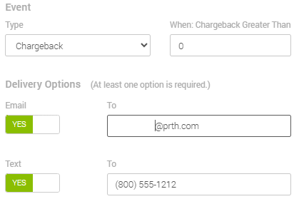 - In When: Chargeback Greater Than, enter the minimum chargeback amount at which you would like to be notified. MX™ Merchant will put in 0 by default, meaning that any chargeback, even one for $0.01, would be immediately reported.
