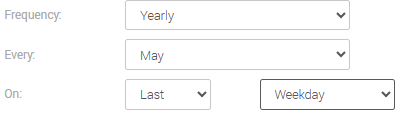 - If the frequency is Yearly, it will show either a full date (for example, "January 8") or a month accompanied by an ordinal and a day of the week (for example, "March last Saturday" meaning "On the last Saturday of March of every year").