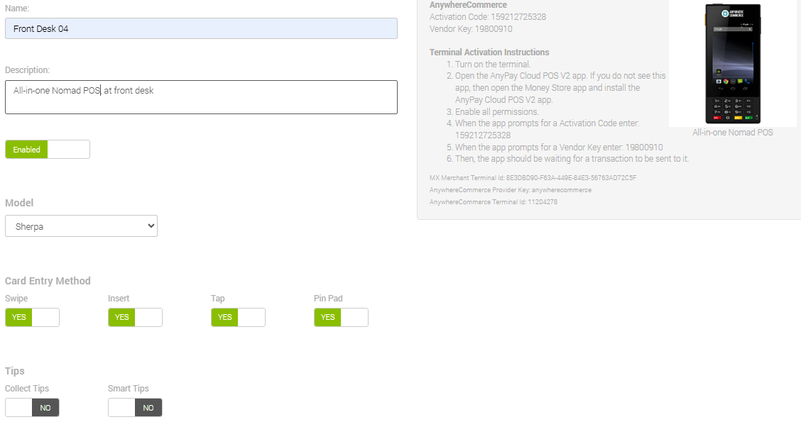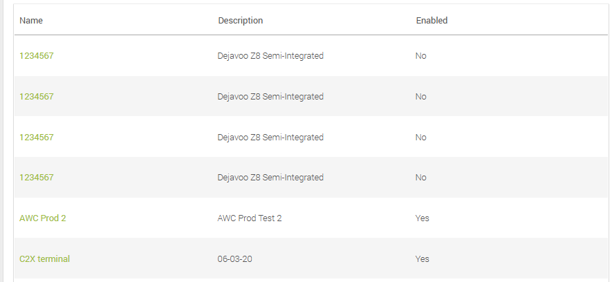 - Enabled - Indicates whether the terminal is currently active. Yes shows it to be enabled, while No shows it to be disabled.